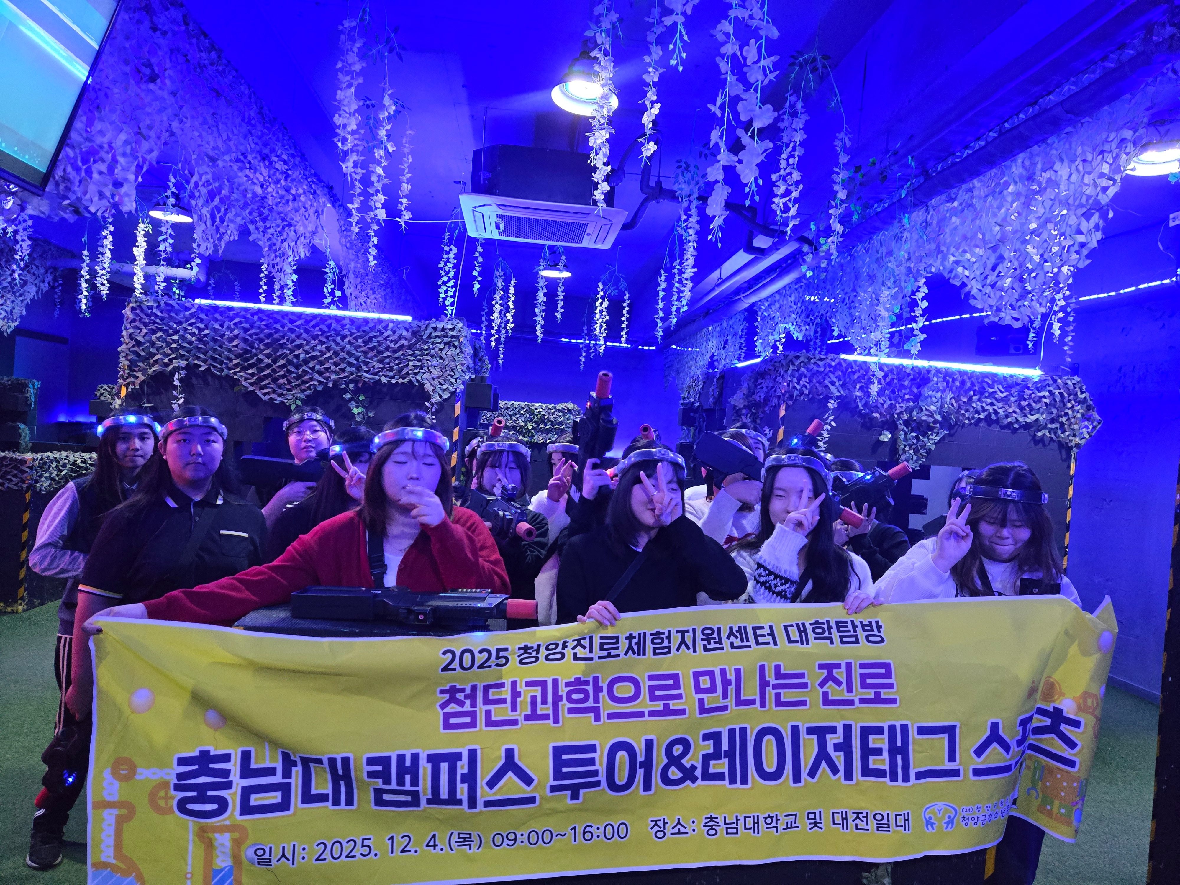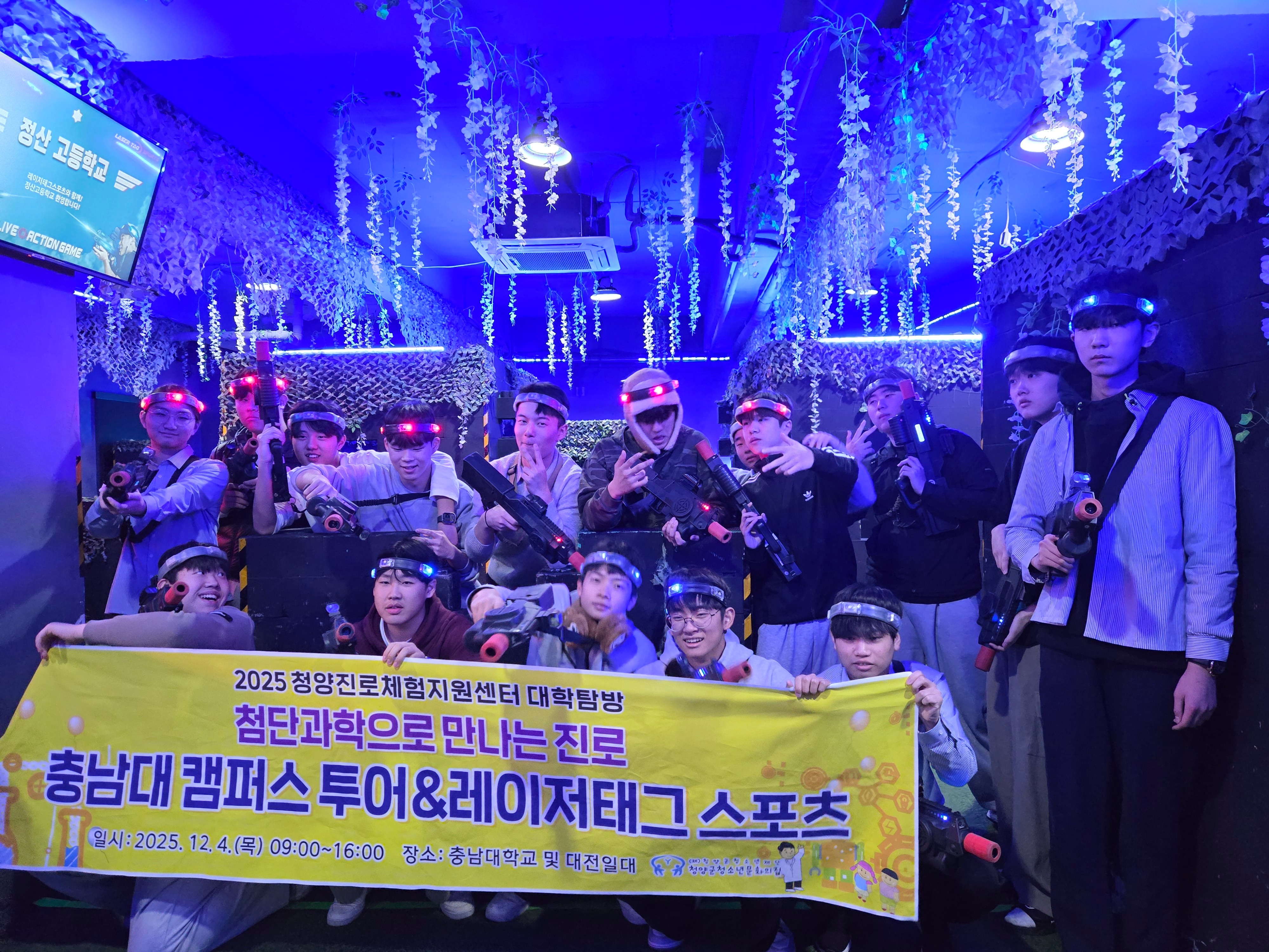 지난 12월 4일 정산고등학교 1학년 친구들과 함께 충남대학교 대학탐방과 이색 진로체험 레이저태그 스포츠를 다녀왔습니다. 충남대학교에 재학중인 홍보대사와 함께 입시 설명 및 캠퍼스 투어를 진행하였으며, 충남대학교 내에 있는
